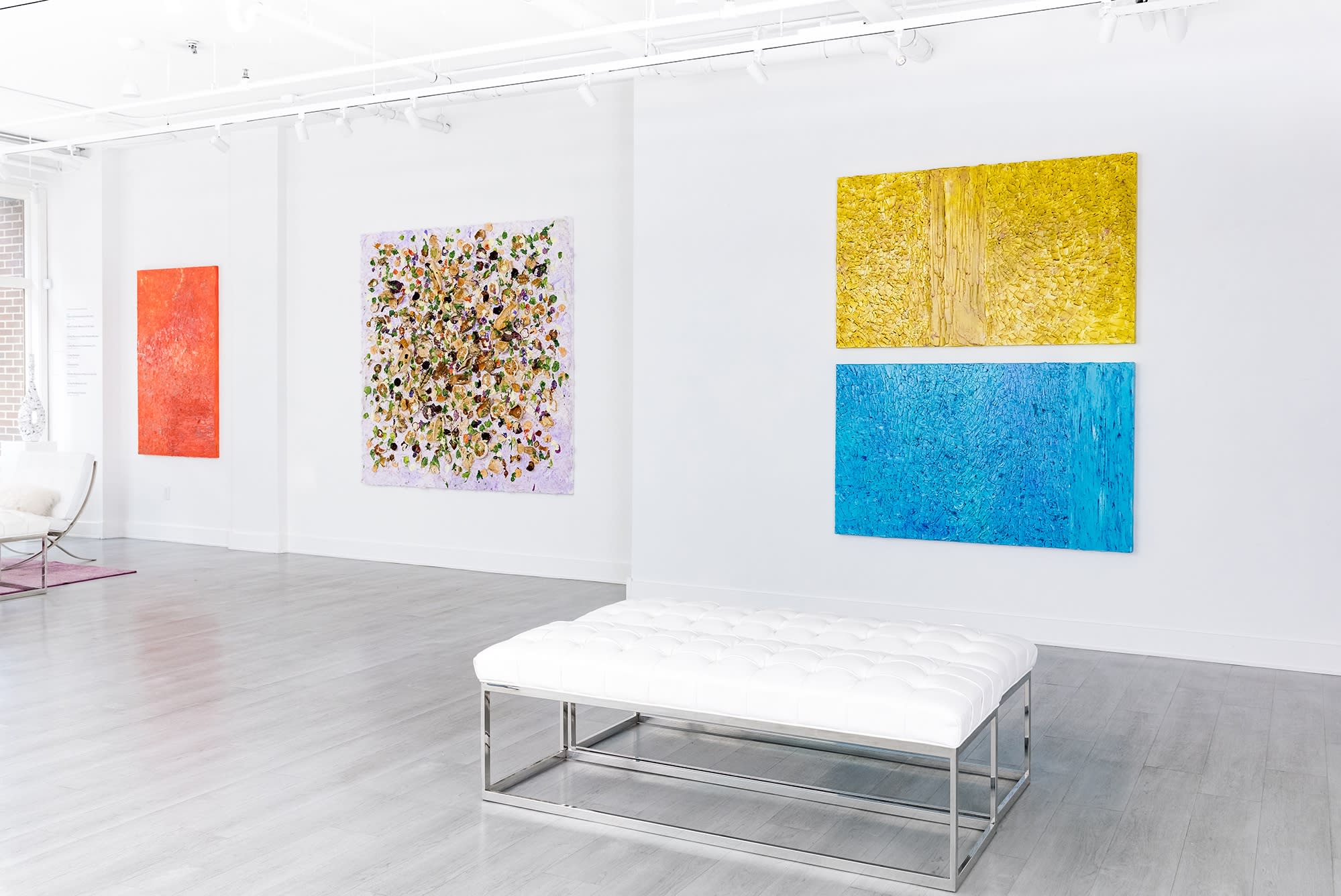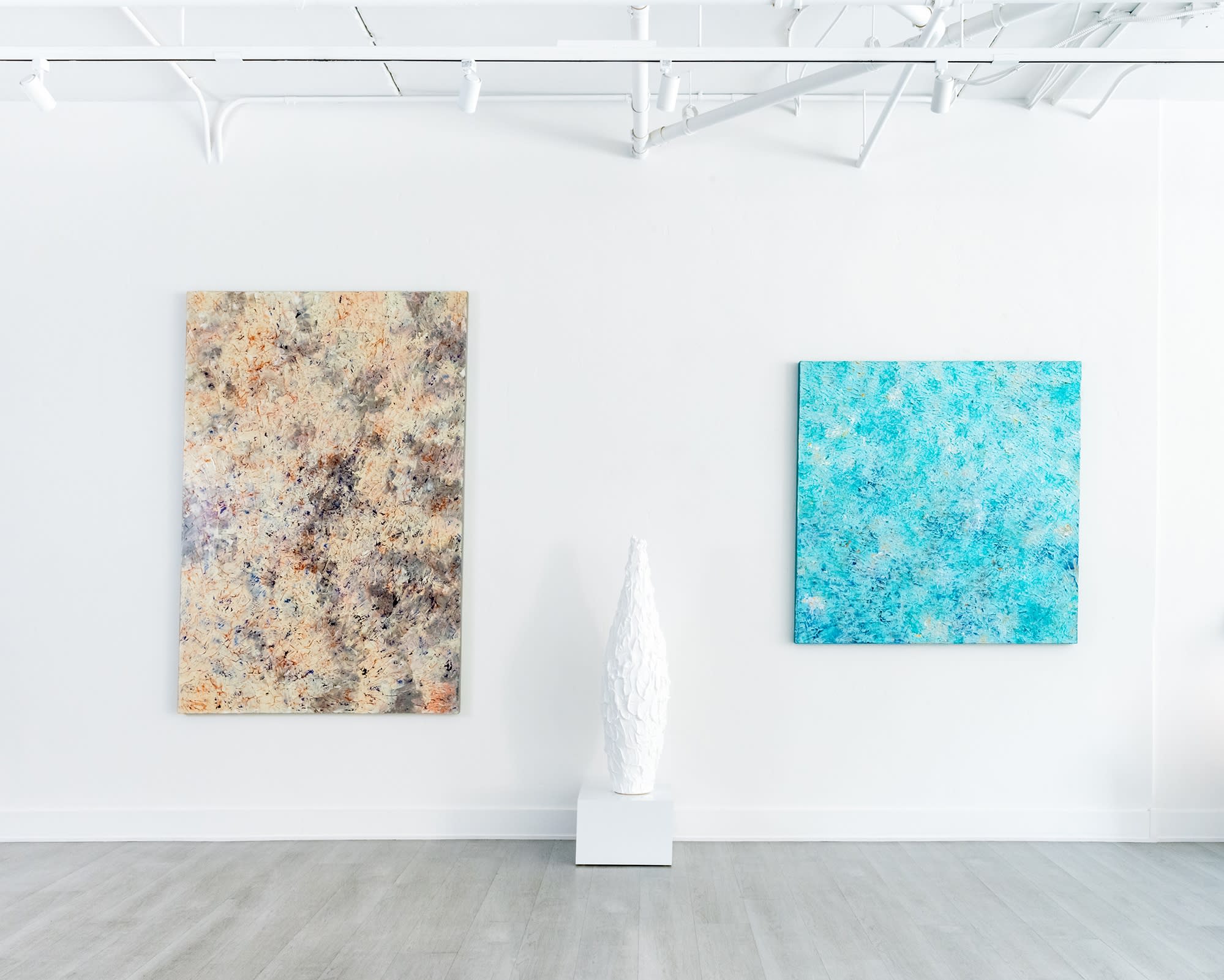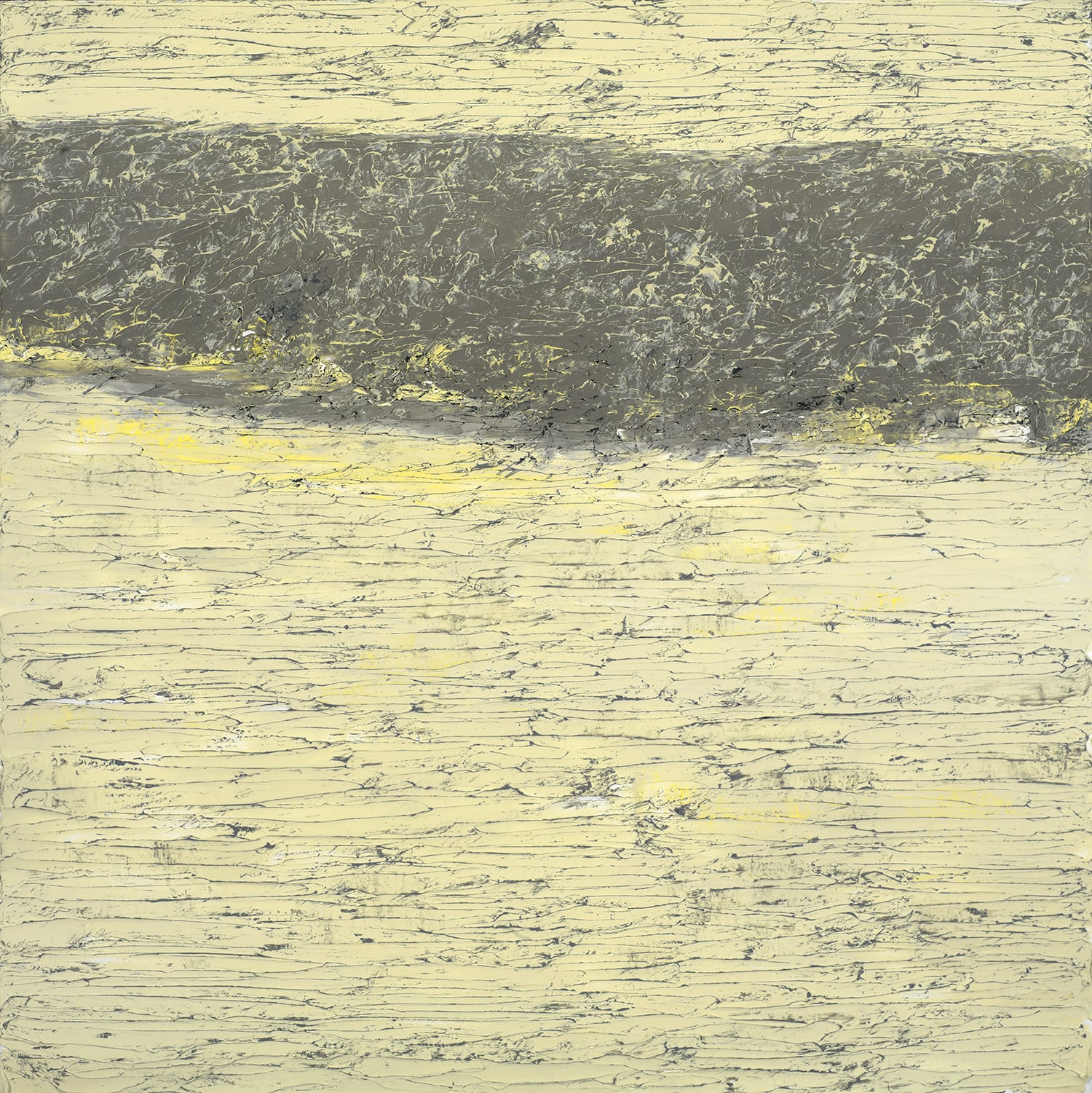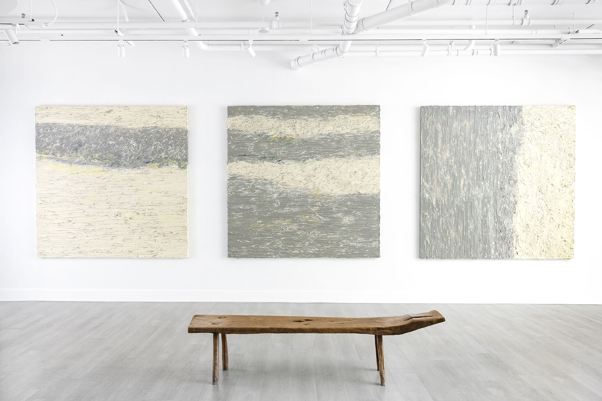 Each measuring 6 feet square, the three largest paintings in the Breaking Away series are a combination of natural earth tones, a sandy white and a mineral gray, applied in coordinating horizontal and vertical striations to give the impression of earth's natural geometry.