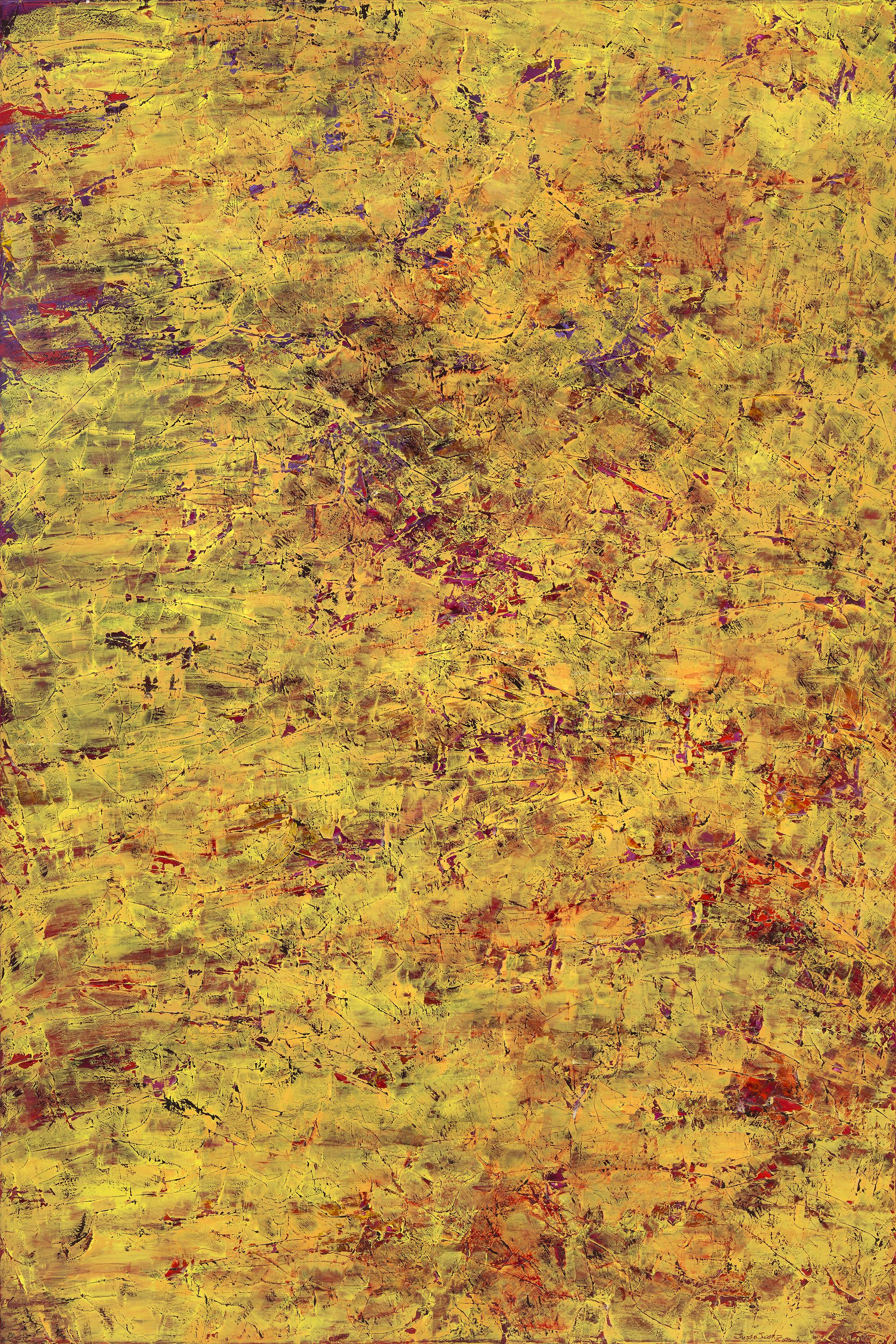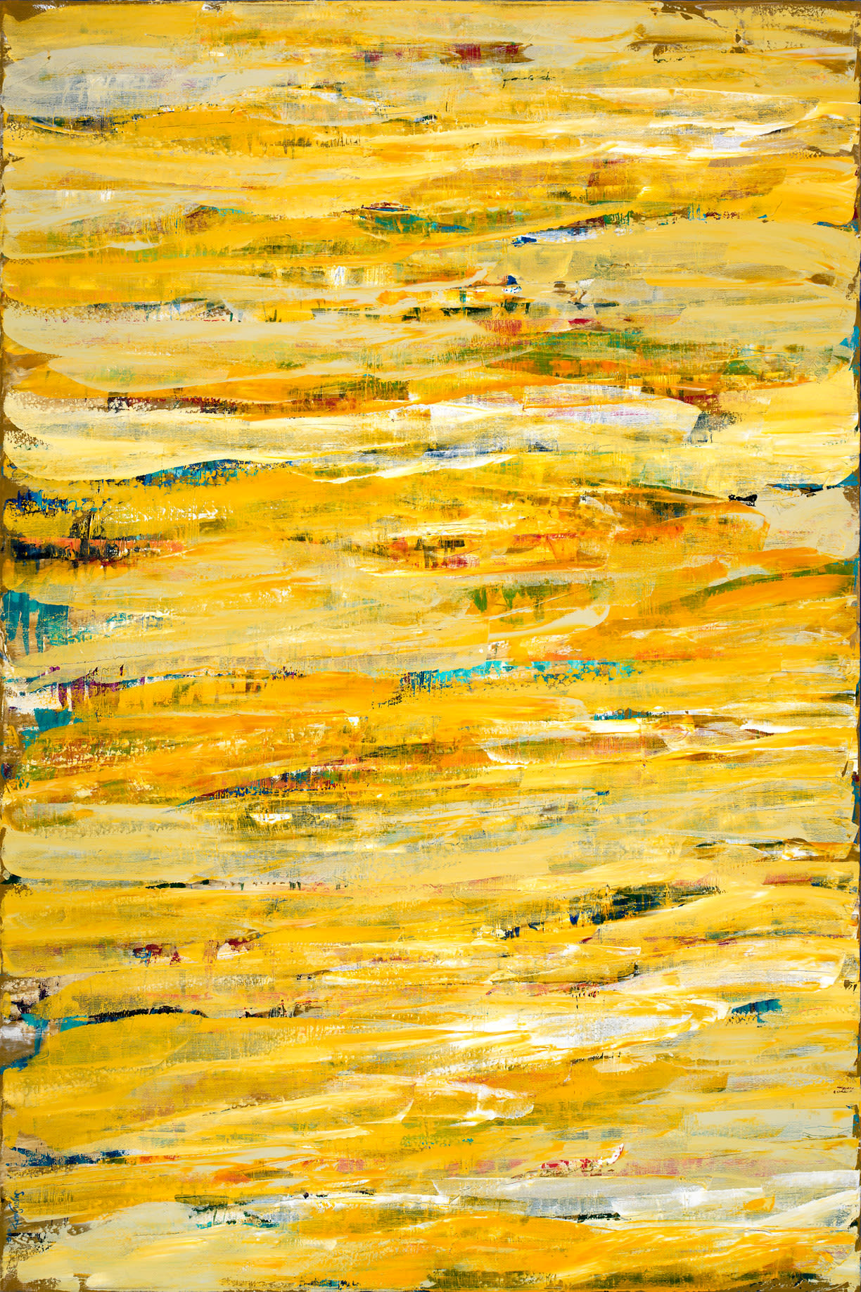 Six 20x20" paintings neighbor in a linear grid, filling the space with vibrant yellows, greens, and reds. The colors and textures call to mind the changing colors of autumn. The surface of Changing Seasons 1 is delicately embedded with leaves, expressing in a painterly motion the swiftness of one season cycling to the next.