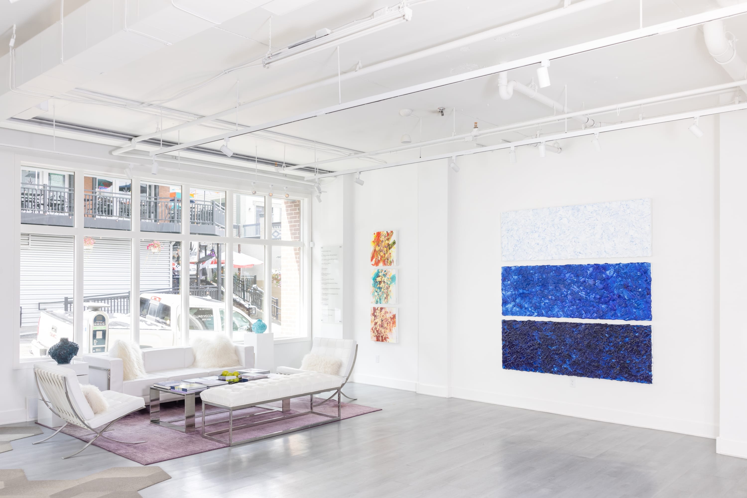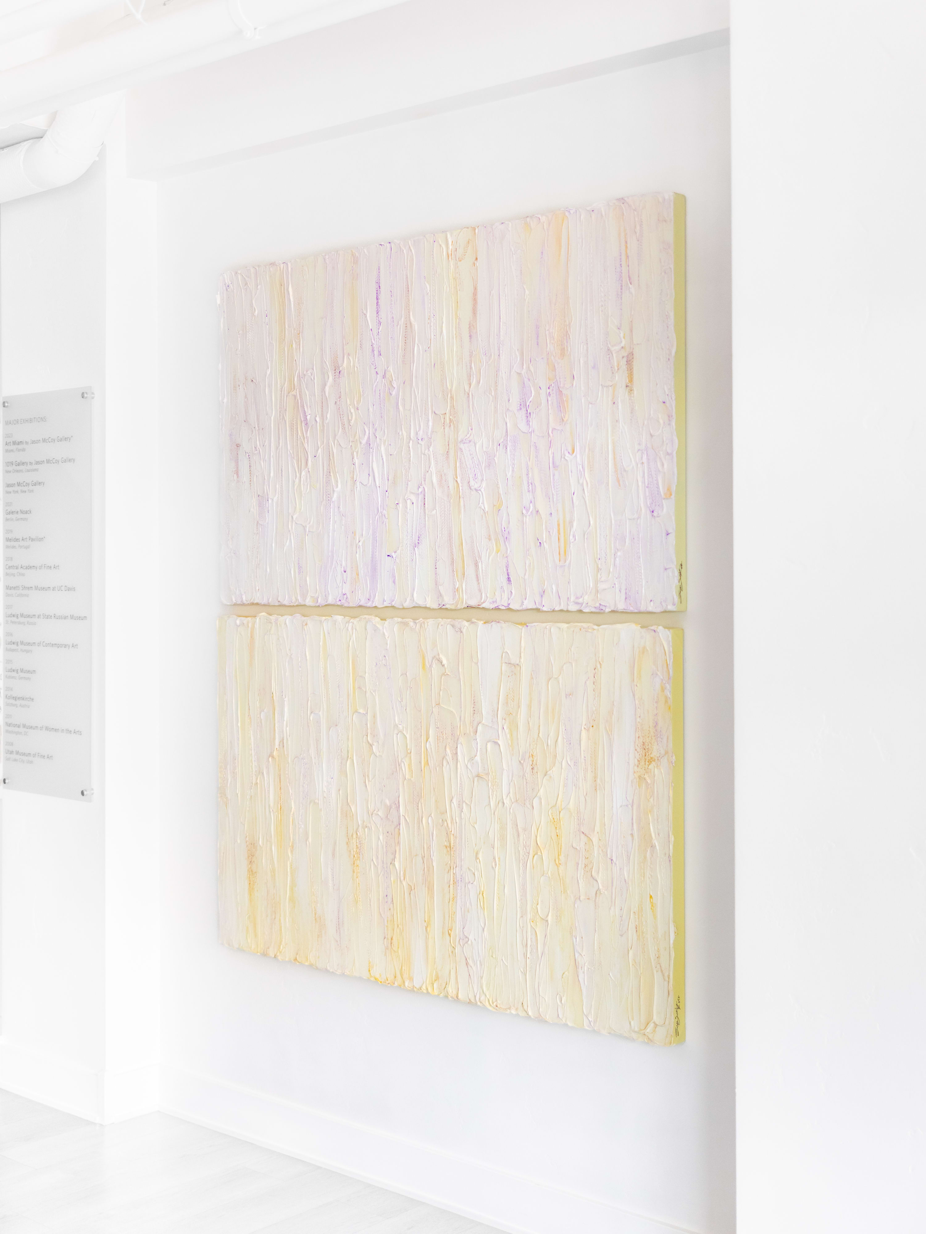Susan's largest piece from the landmark Evolution of Nature series pops next to Natural Flux 102, a painting that is almost entirely white aside from minimal gray accents that highlight the frosty texture.