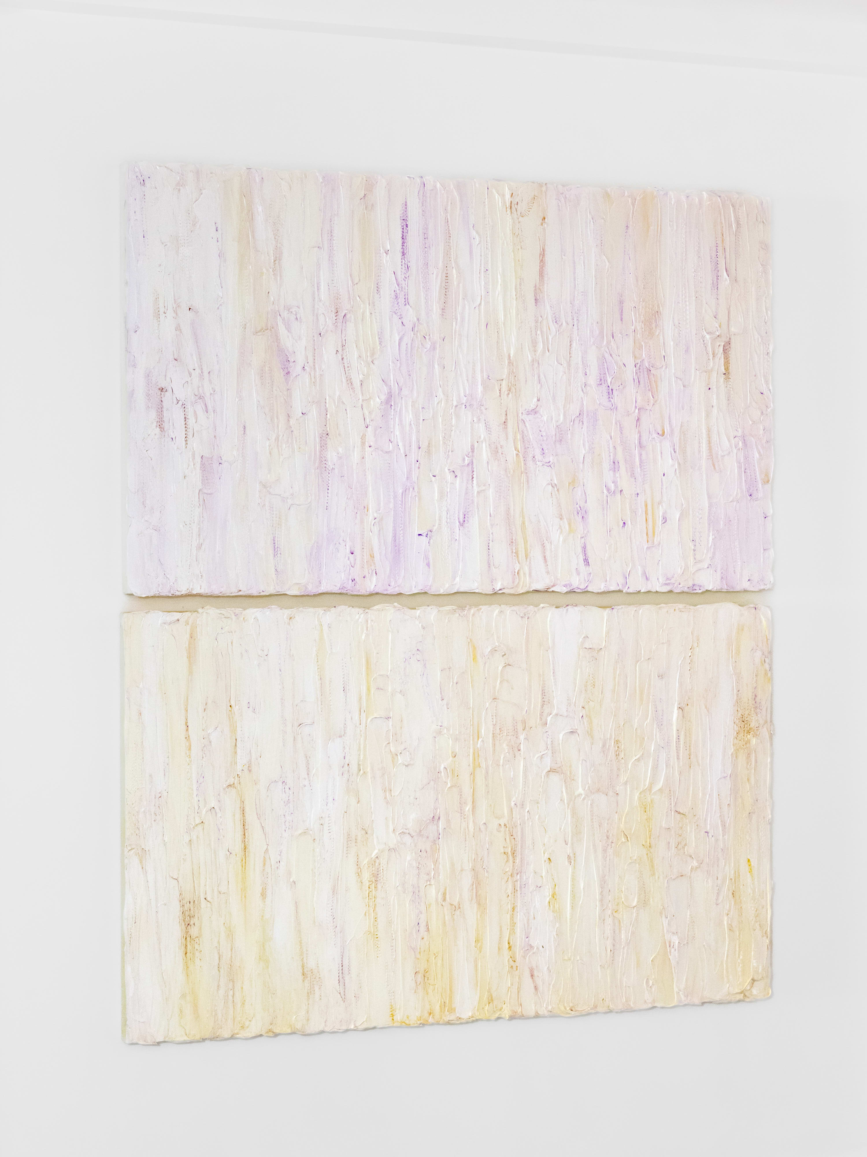 At the back of the gallery hangs Landscape of Resonances 001, a striking work made up of strong vertical striations reflective of Aspen trees. Flanked by two vases, the arrangement finds a perfect balance between the bold and the quiet.