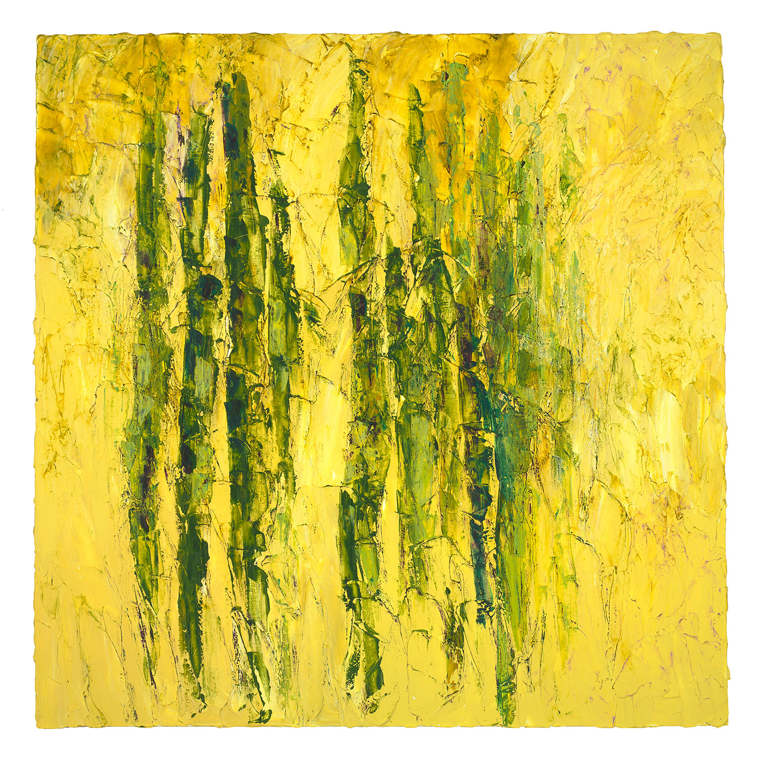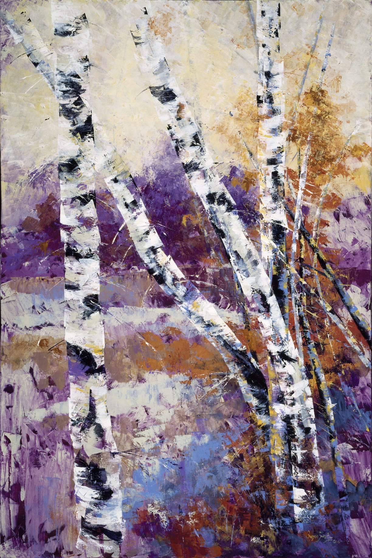 At the front of the gallery hangs Secluded Woodland 4 and 5. Swartz conveys the spiritual experience and lifeblood surrounding her Park City studio with these large-scale aspen forest paintings. Swartz merges the evolution of her style, drawing aspen trees into striations, highlighting the depth and light between them. The result is a romantic drama that captures the beauty of Utah's aspen groves.