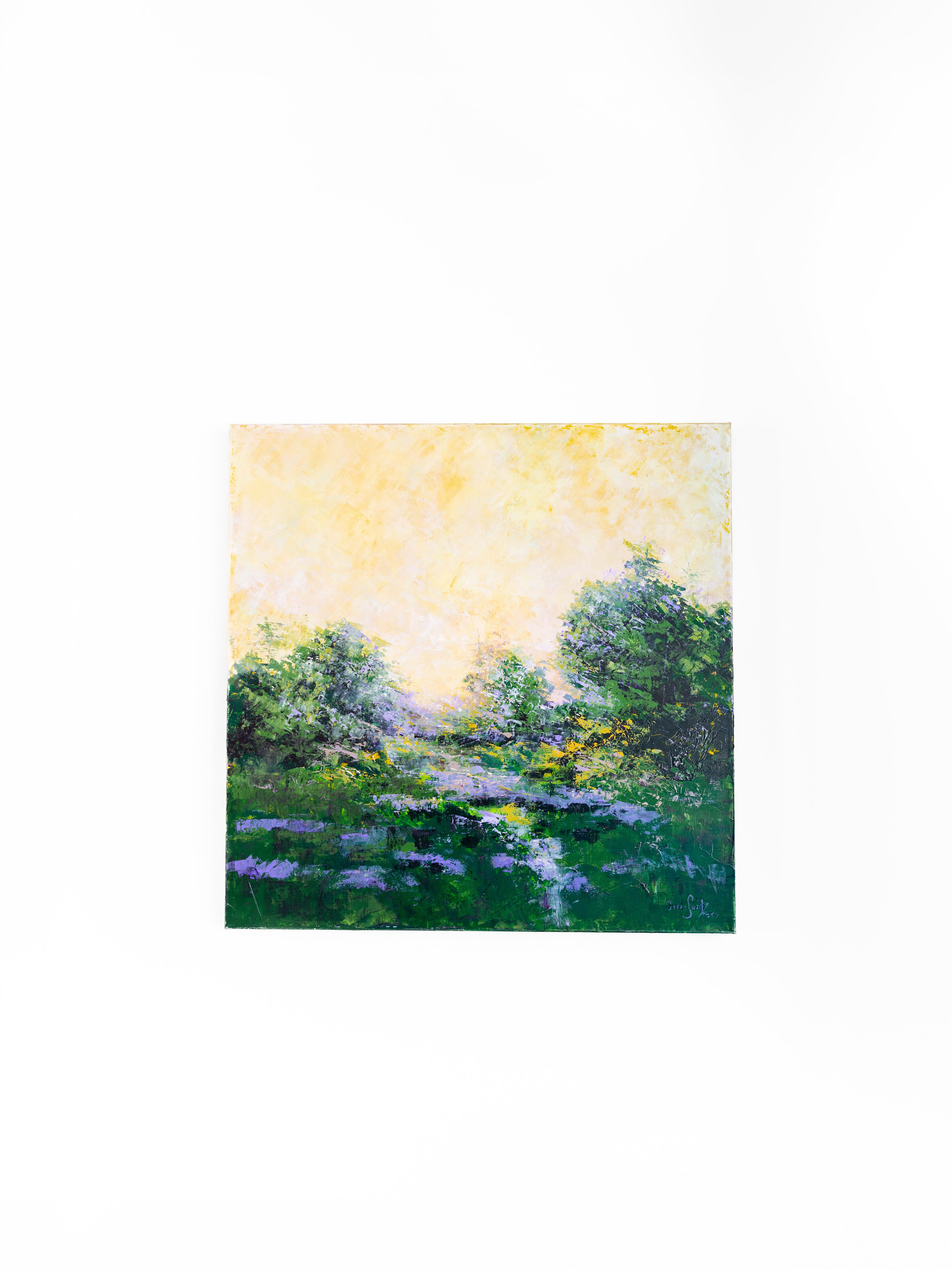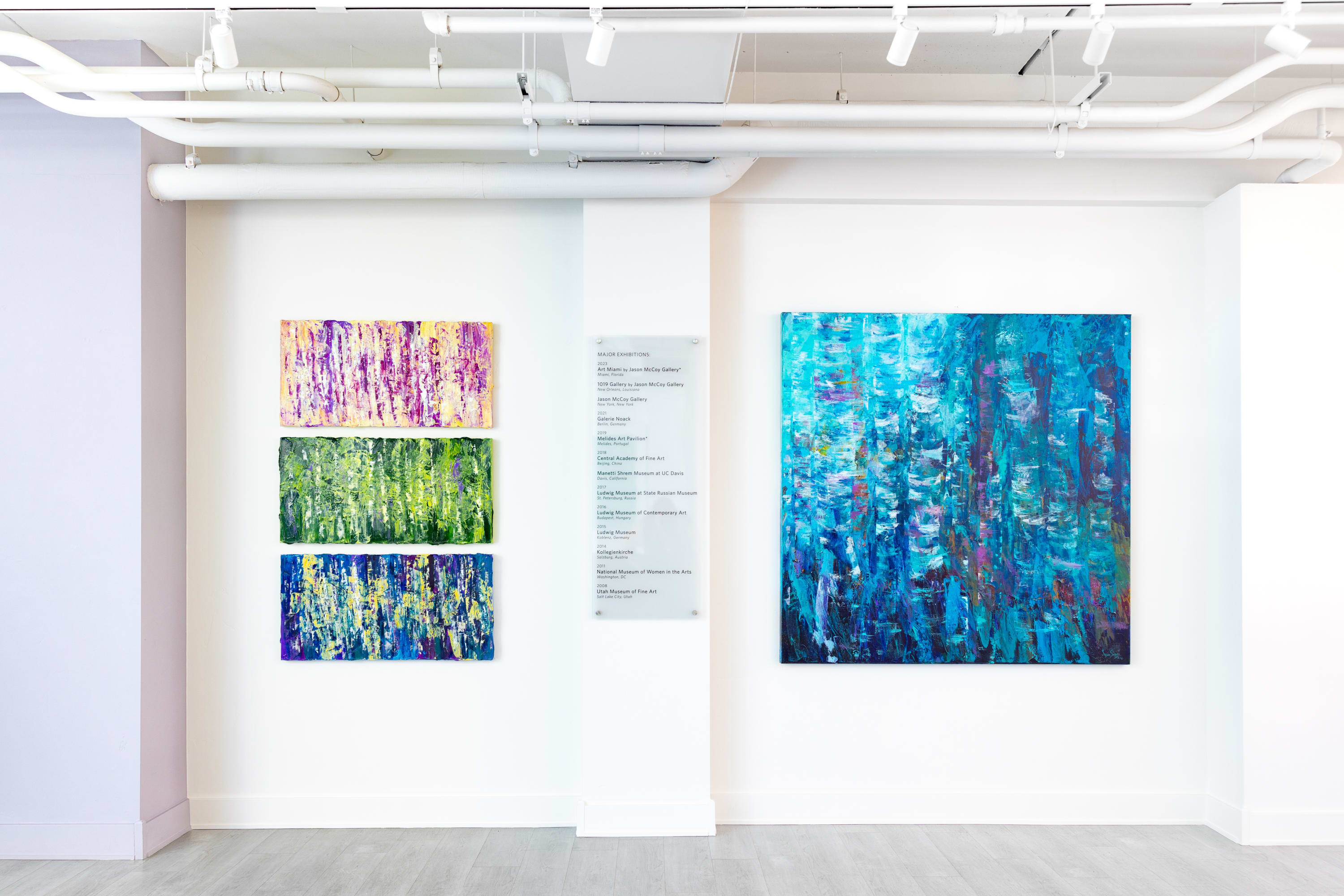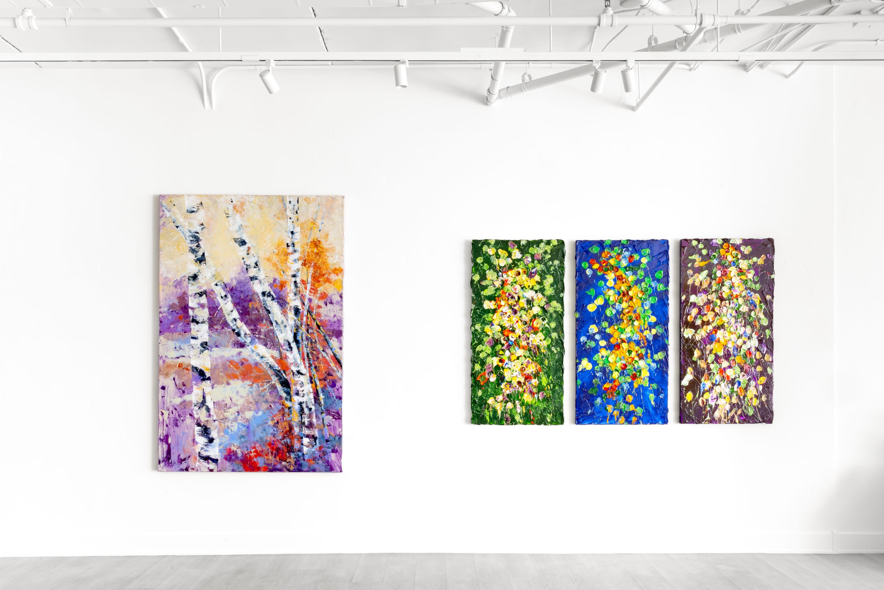 In The Awakening, Swartz incorporates light as an expressive element that dances on the surface of the canvas, capturing the radiant glow of fall. Alongside hangs a set of three Nature’s Bouquet canvases, each one a confetti of color.