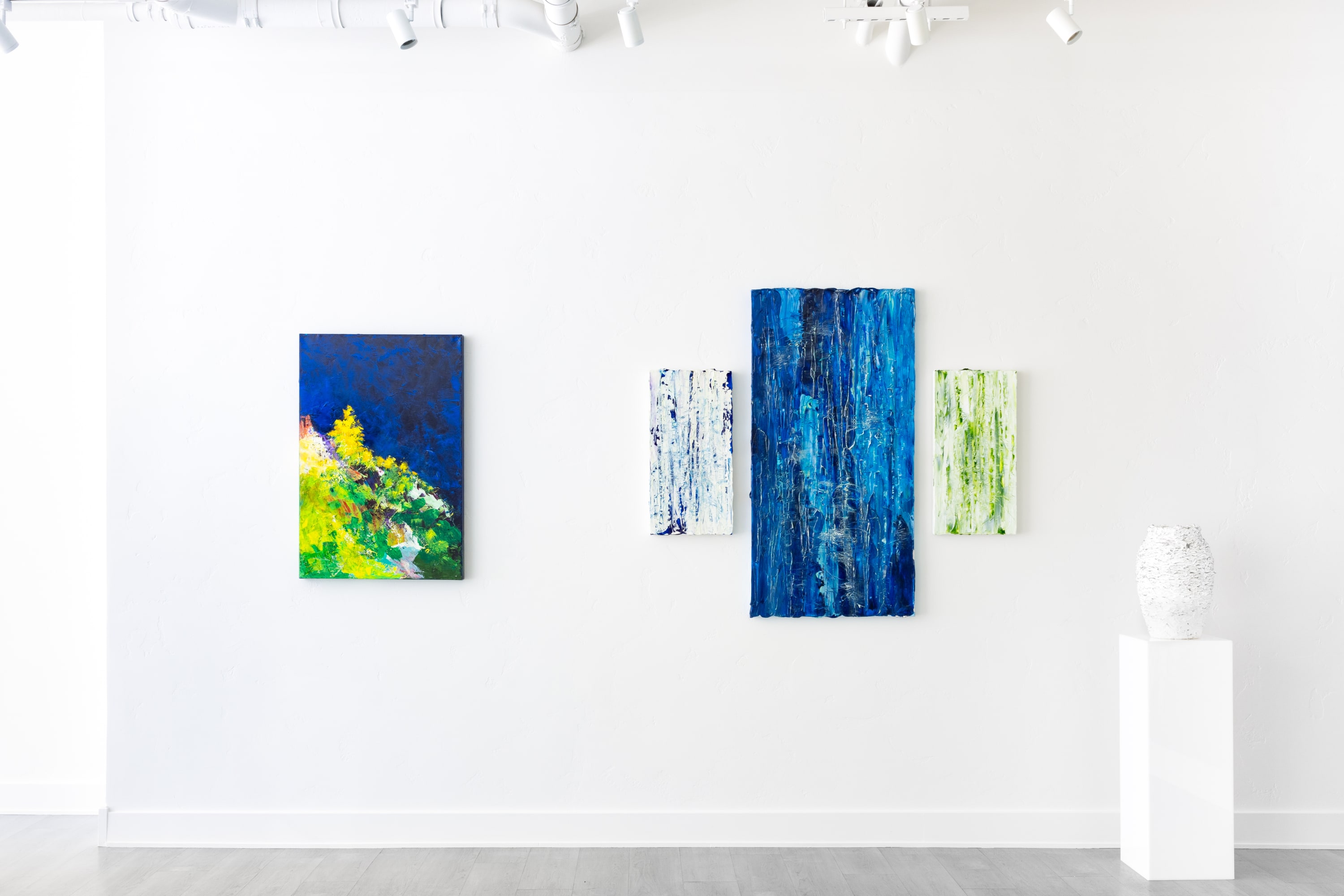 At the back of the gallery hangs Landscape of Resonances 001, a striking work made up of strong vertical striations reflective of Aspen trees. Flanked by two vases, the arrangement finds a perfect balance between the bold and the quiet.