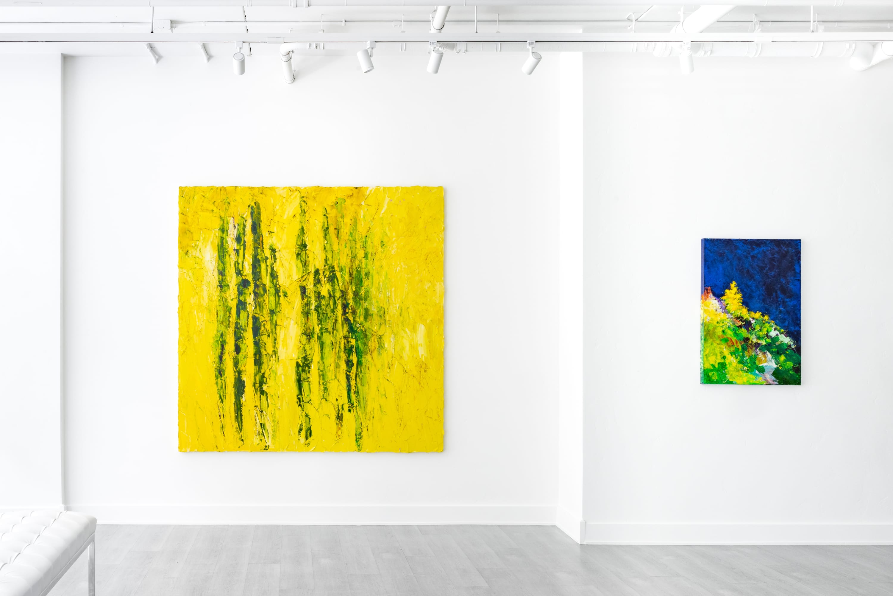 Susan's largest piece from the landmark Evolution of Nature series pops next to Natural Flux 102, a painting that is almost entirely white aside from minimal gray accents that highlight the frosty texture.