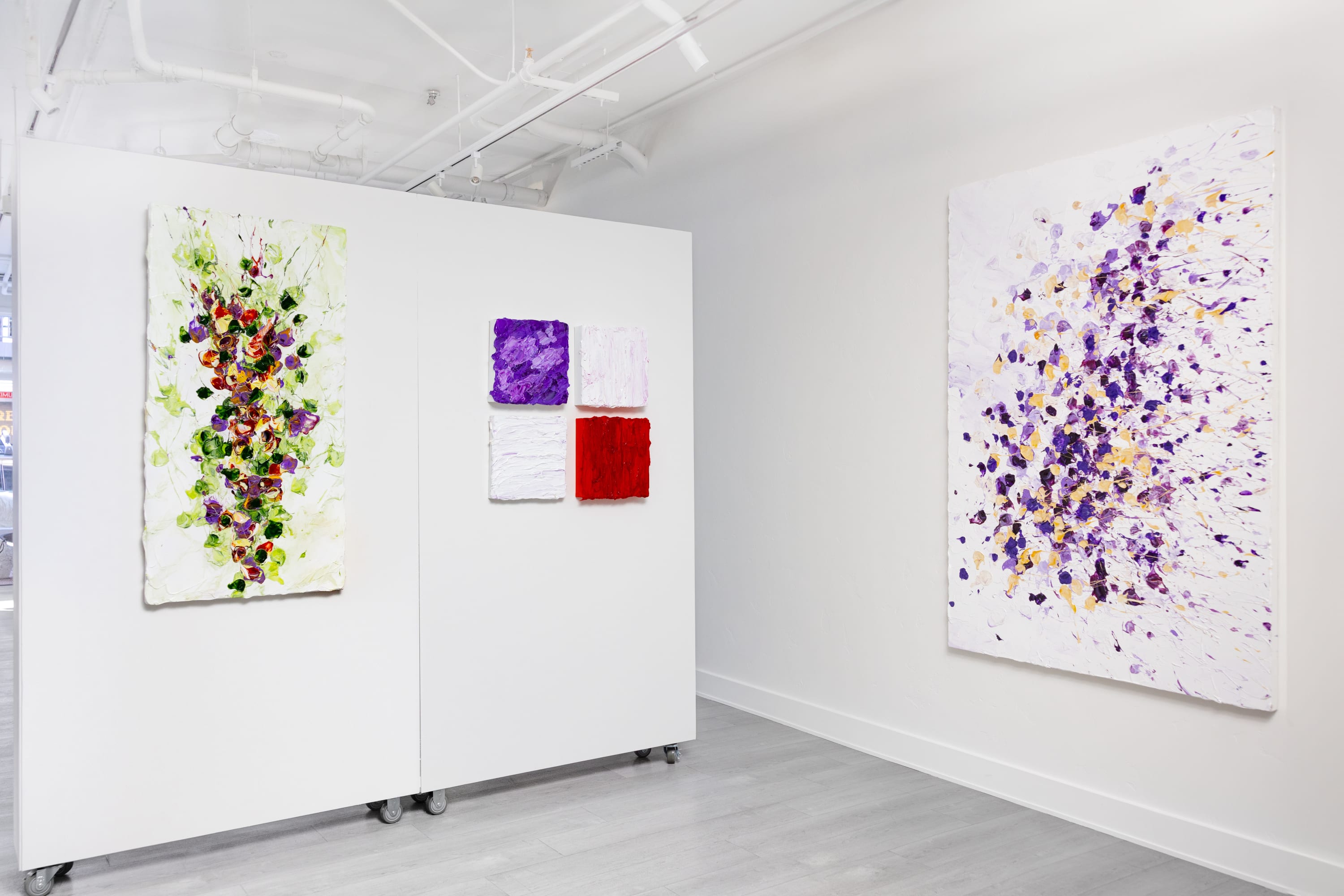 In Nature's Bouquet 69, rich purples are energetically applied over an ivory-toned surface. Adjacent, limited edition black and white giclée prints are suspended in front of a raw concrete wall providing natural elegance and serenity.