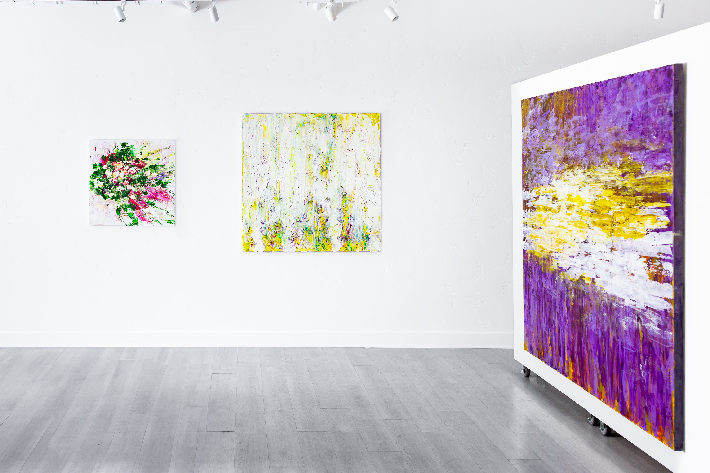 At the front of the gallery hangs Solitude Released, a vertical painting oscilating between green and yellow hues, applied in thick, upward waves and embedded with small, dried herbs. Nearby a selection of fifteen 12x12" canvases are arranged in a geometric grid. Both the arrangement and thickly painted surfaces errupt forward like a bountiful bouquet. The array demonstrates Swartz's playful, evolving experimentation with color and texture. In each small canvas, she captures the way nature evokes a powerful and unwavering joy in her.