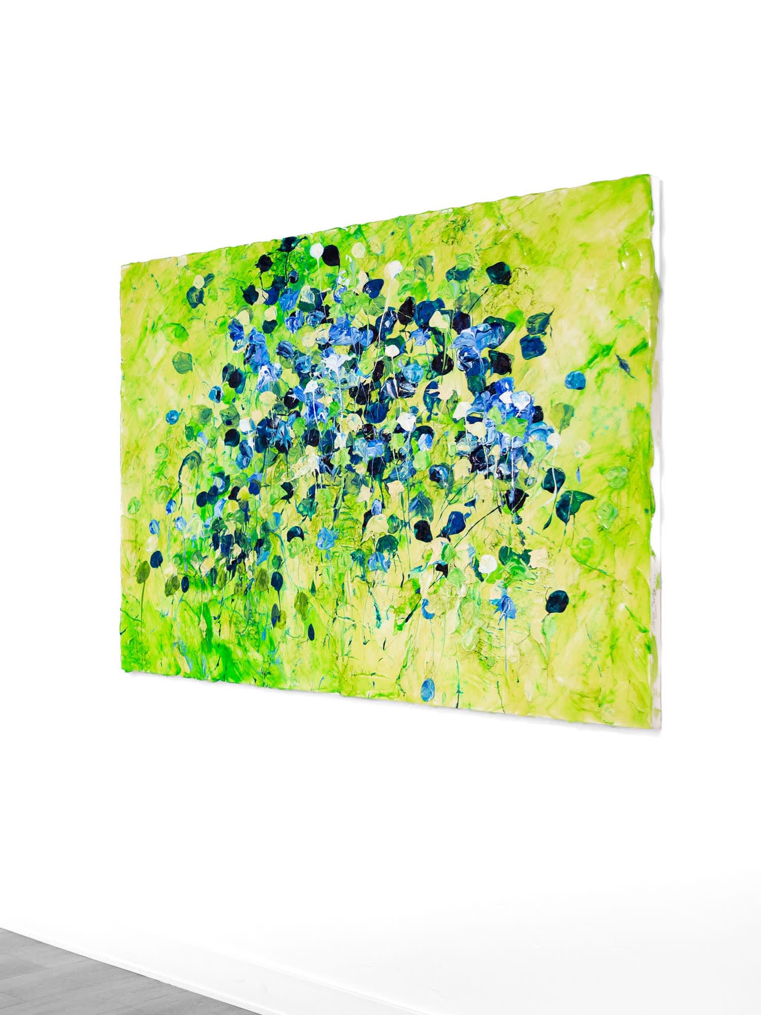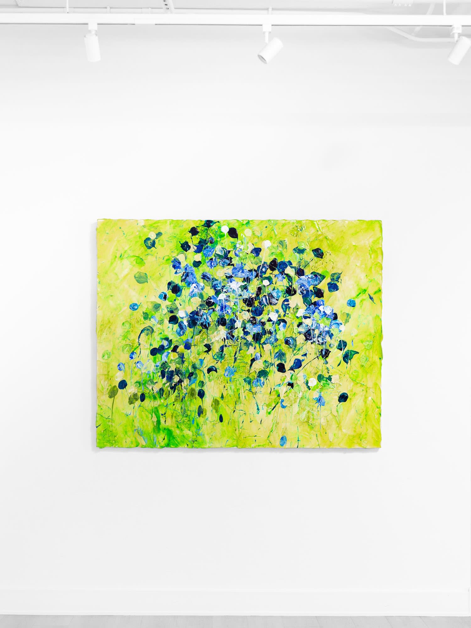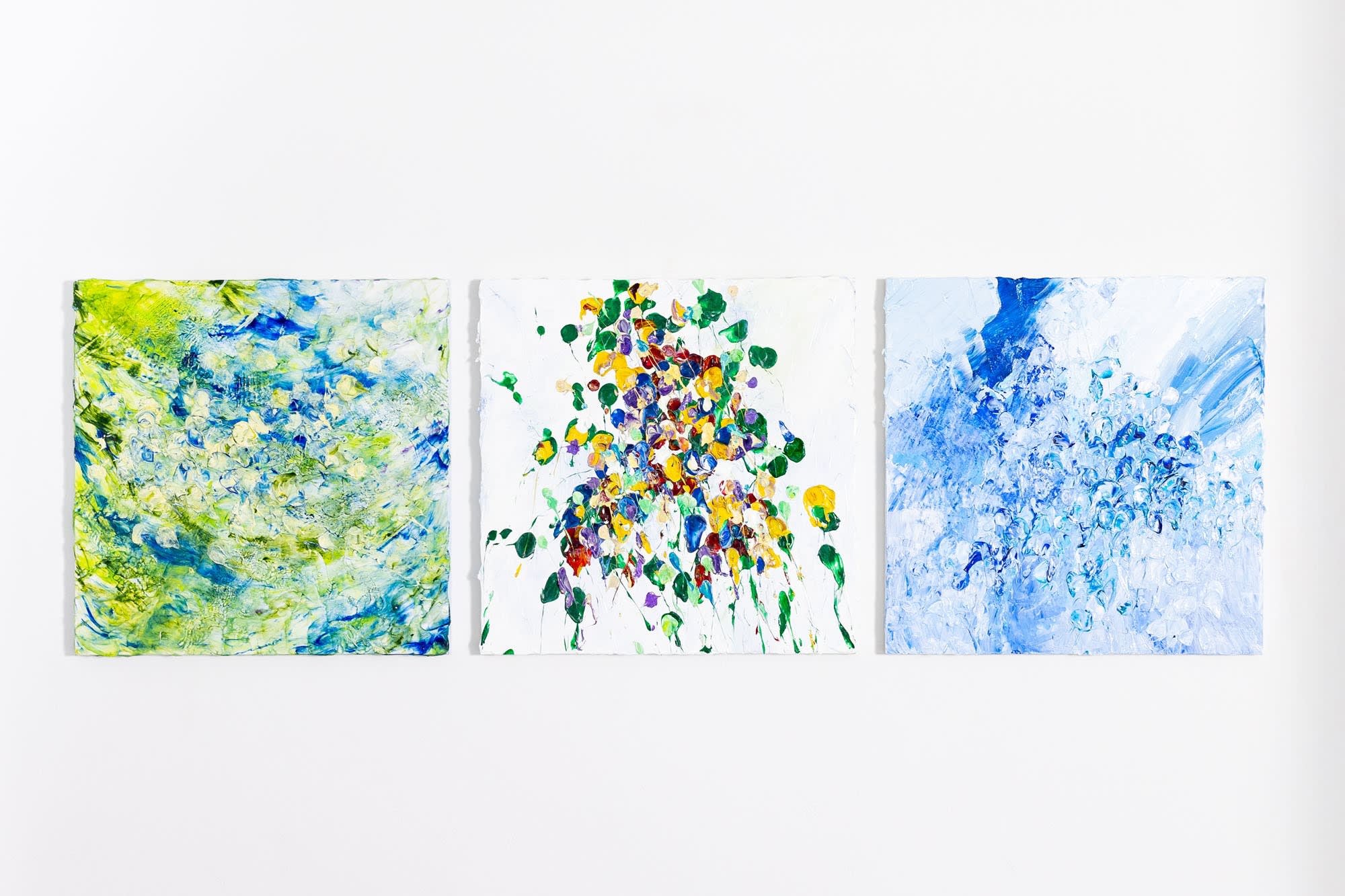 Boundless 7 features a vivid blue background with bright green, organic forms layered on top, while Nature’s Bouquet 54 reverses the palette—bold green beneath soft, blue painterly shapes. Between them, Emerging Bouquet 63, a quiet white painting with delicate hints of blue and purple offers a moment of calm, balancing the surrounding intensity with subtle serenity.