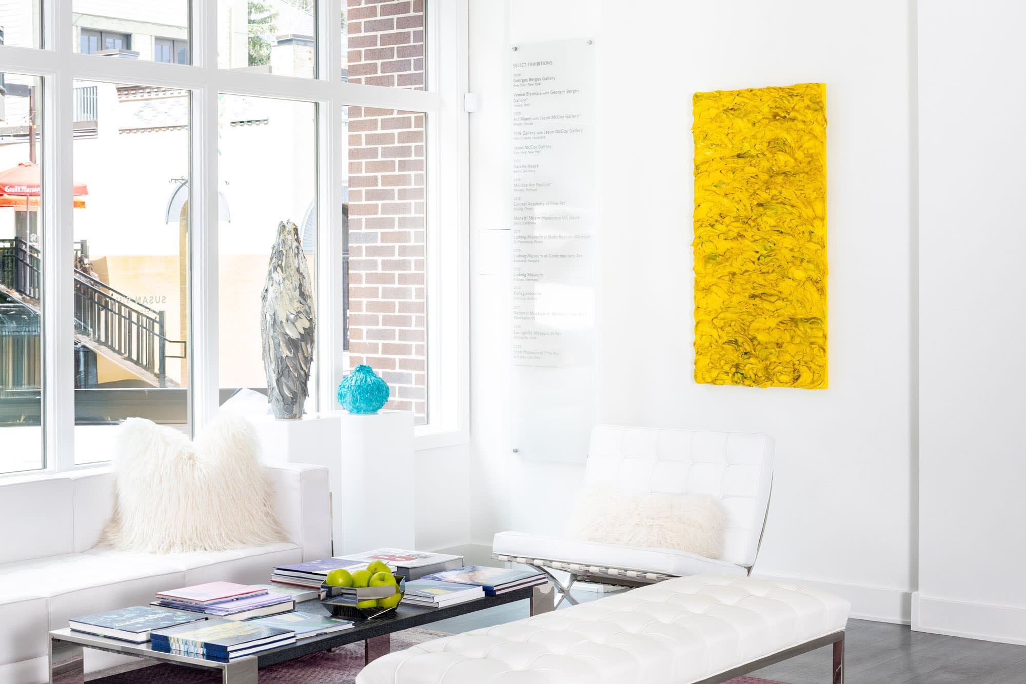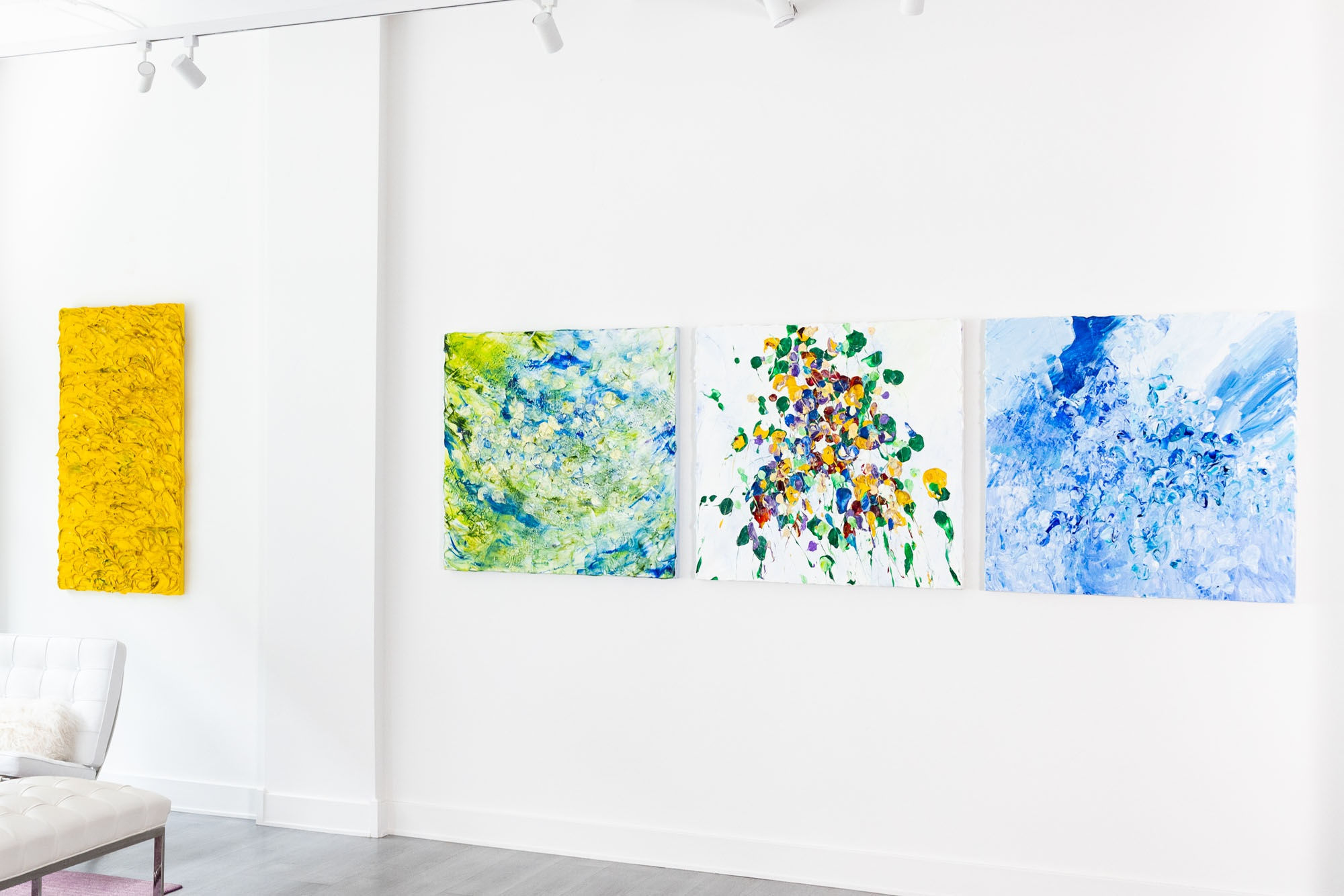 At the front of the gallery, a vibrant yellow painting from the Rhapsody series sets a bold tone with thick, swirling strokes that radiate warm energy. Beside it, Shimmering Impressions 13 offers a softer, reflective moment with its luminous surface reminiscent of water lilies. Nature’s Bouquet 84 bursts with joyful color, its bright splashes blooming over a creamy background, while Emerging Bouquet 30 brings a quieter mood with soft blues and whites—like petals just beginning to unfurl.