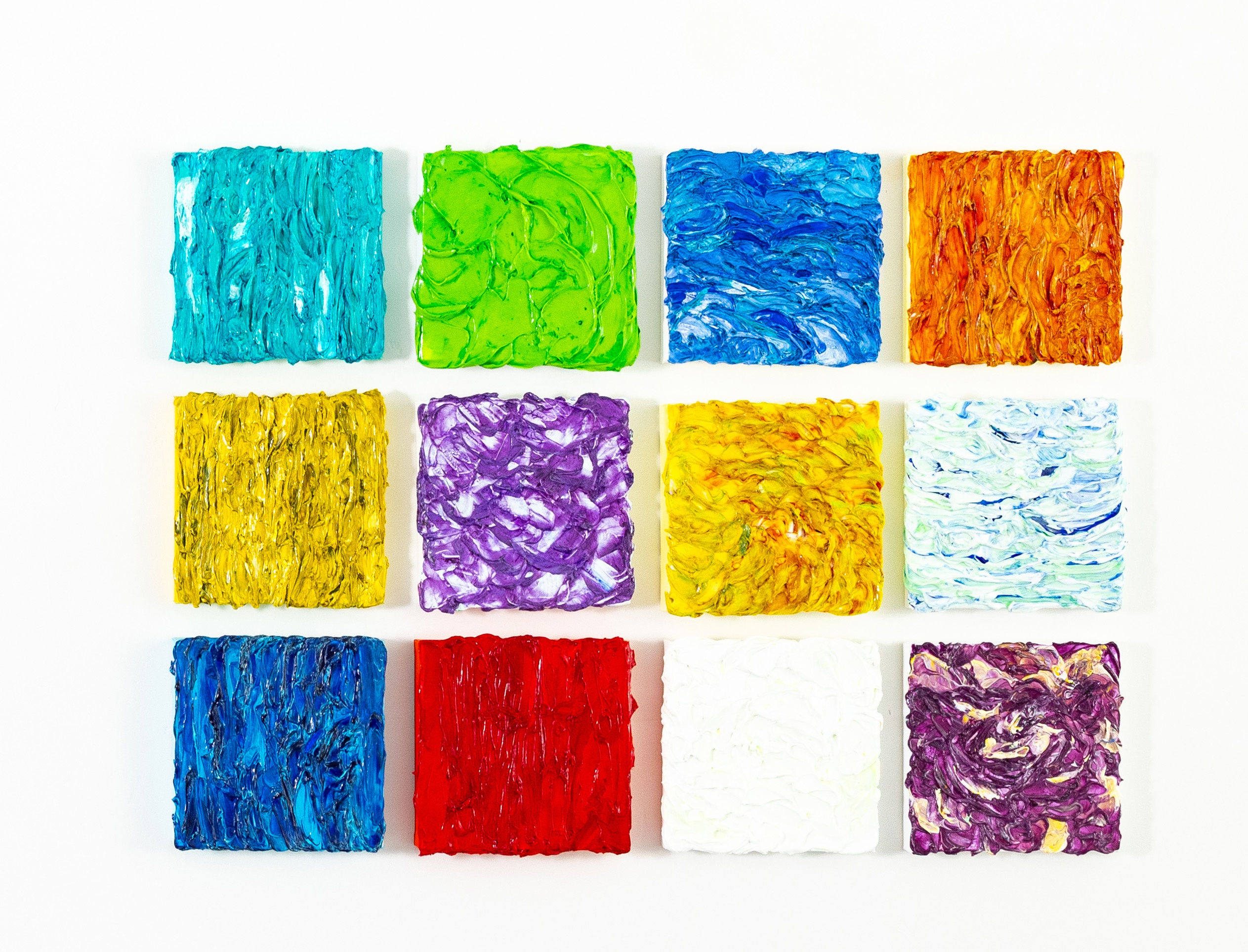 A vibrant grid of small, monochromatic canvases lines one wall—each a different hue with thick, textured surfaces and organic patterns that echo forms found in nature. Beside it hangs a large, serene painting from the Celestial Blues series. Its quiet presence offers a calming balance to the energy and color of the grid, creating a harmonious dialogue between bold expression and gentle stillness.
