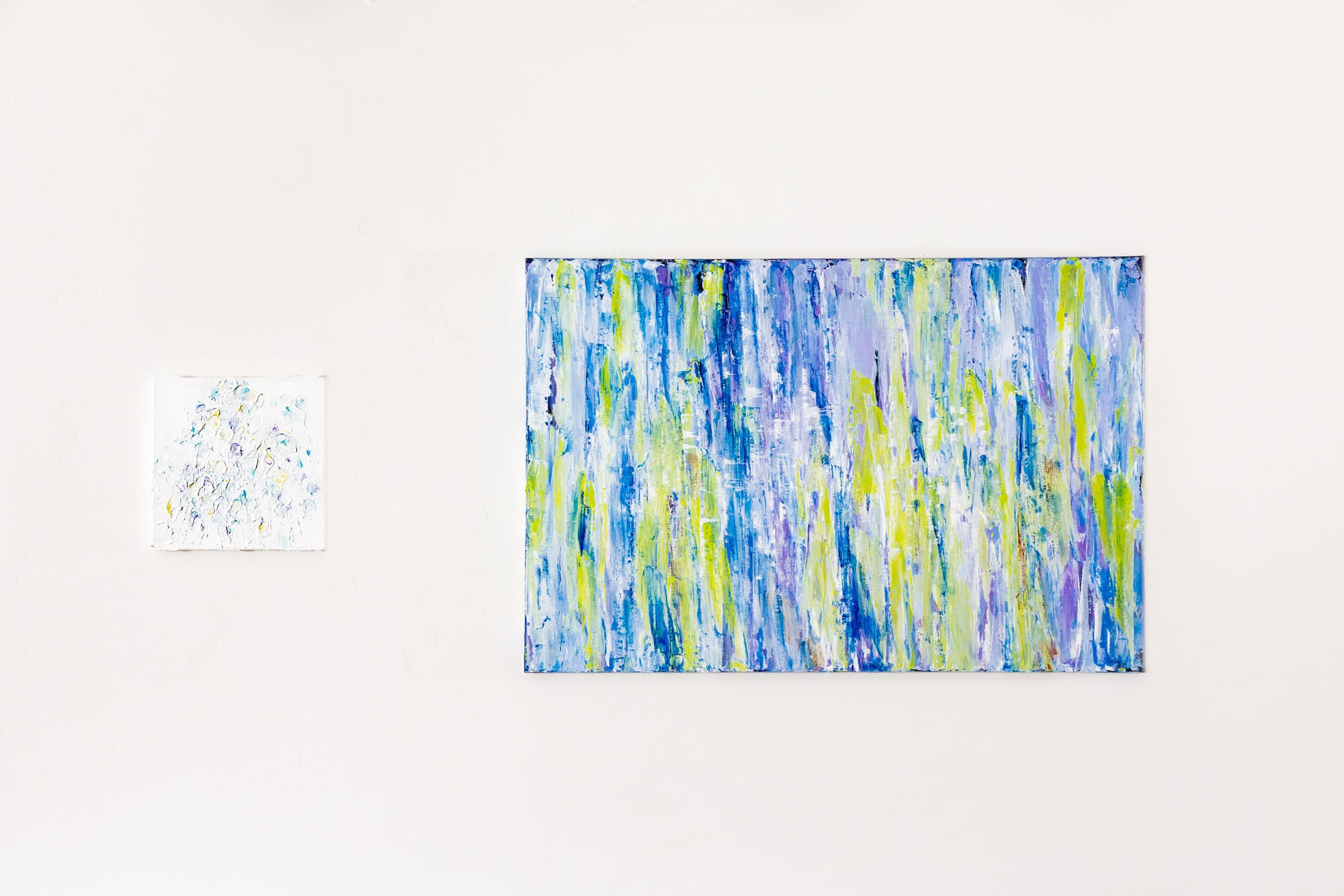 A second grid of 12x12" paintings offers a softer counterpart to the bolder arrangement near the front of the gallery. Each canvas features a mix of pastel tones inspired by the artist's gardens—blobs of paint suggest petals or blooms, while drips hint at trailing stems. Though varied in color, the grid as a whole evokes a gentle, spring-like atmosphere, full of lightness and growth. Adjacent are Rhapsody H and J—monochromatic works in vibrant turquoise and rich purple.